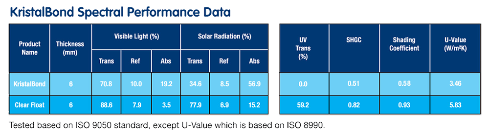 Kristalbond coated 6mm clear float glass samples tested for ultraviolet transmission testing and protection factor testing. Test results revealed a protection factor of 348.